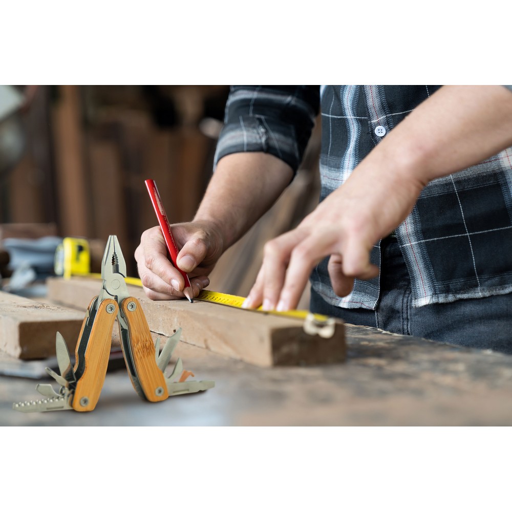 Entdecken Sie das multifunktionale Werkzeug mit 9 Funktionen – der ideale Botschafter für Ihre Marke! Mit einem stilvollen Griff aus Bambus und robustem Edelstahl ist dieses kompakte Tool nicht nur funktional, sondern auch nachhaltig. Ob im Büro oder im Freien, es erleichtert den Alltag Ihrer Kunden und bleibt stets im Blick – ein echter Eyecatcher!